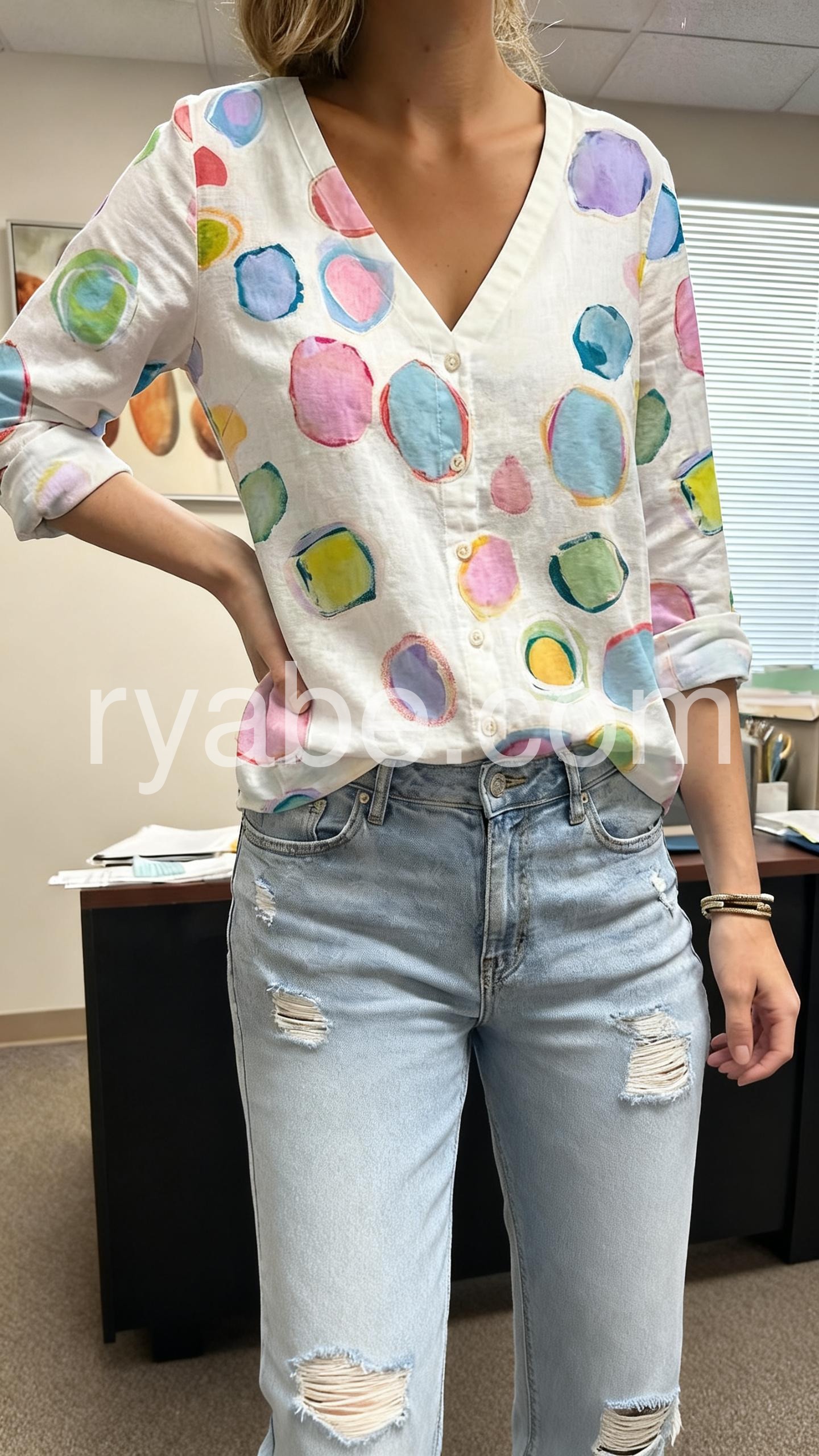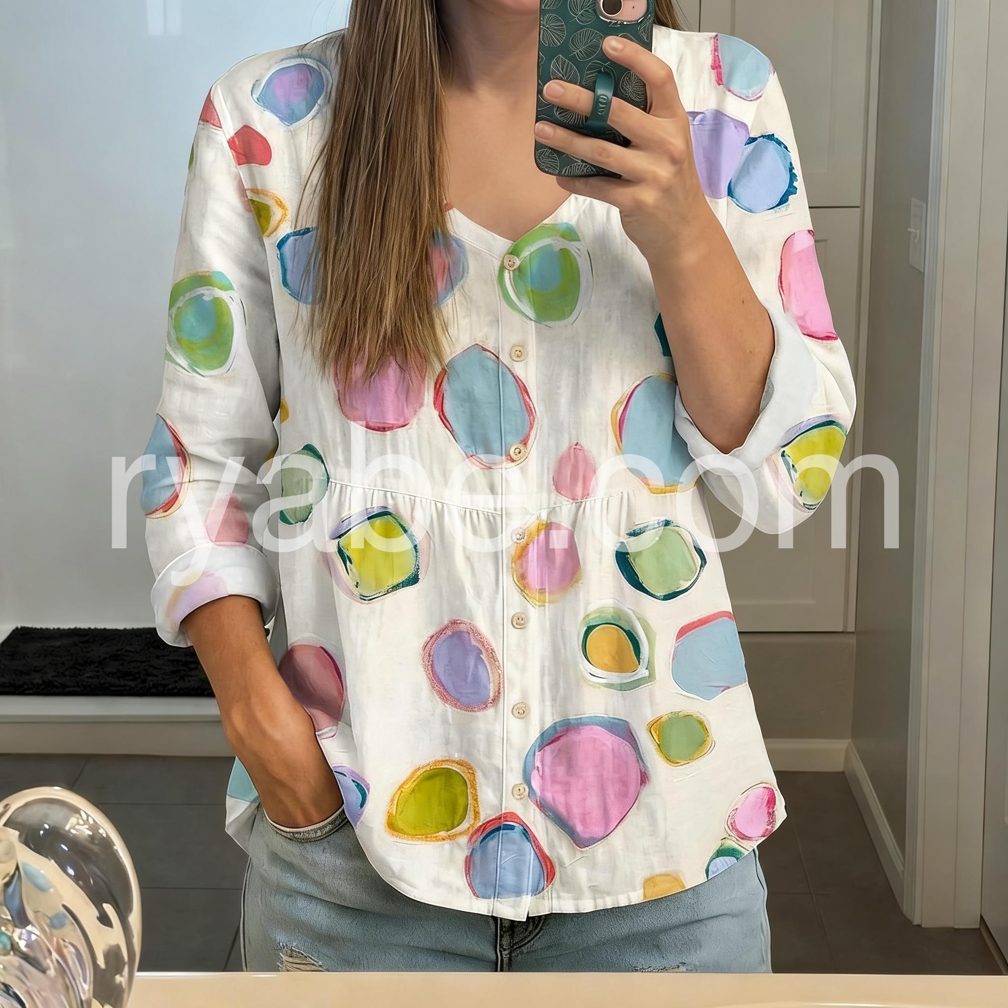 Yes!If you want a refund please contact our customer service at this email([email protected]).This blouse features a vibrant watercolor-style polka dot print on a soft white base. The relaxed fit and button-down front add casual charm. Rolled sleeves and side pockets enhance comfort. Perfect for pairing with jeans or shorts. Ideal for spring and summer days.