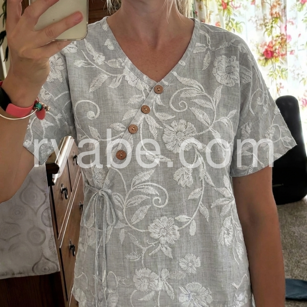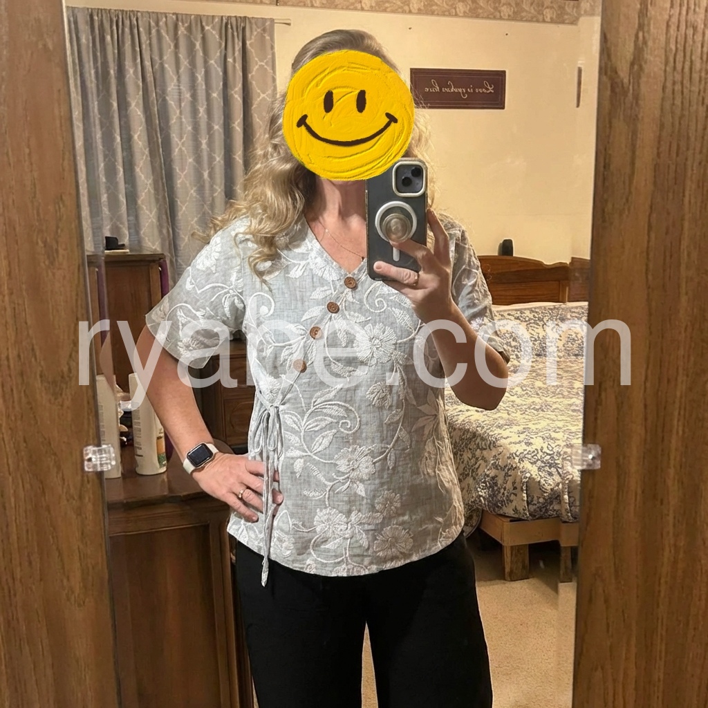 Yes!If you want a refund please contact our customer service at this email([email protected]).This short-sleeve top features a soft gray base with white floral print. V-neckline with wooden buttons and side tie detail. Relaxed fit for all-day comfort. Lightweight fabric perfect for casual wear. Ideal for pairing with jeans or pants.