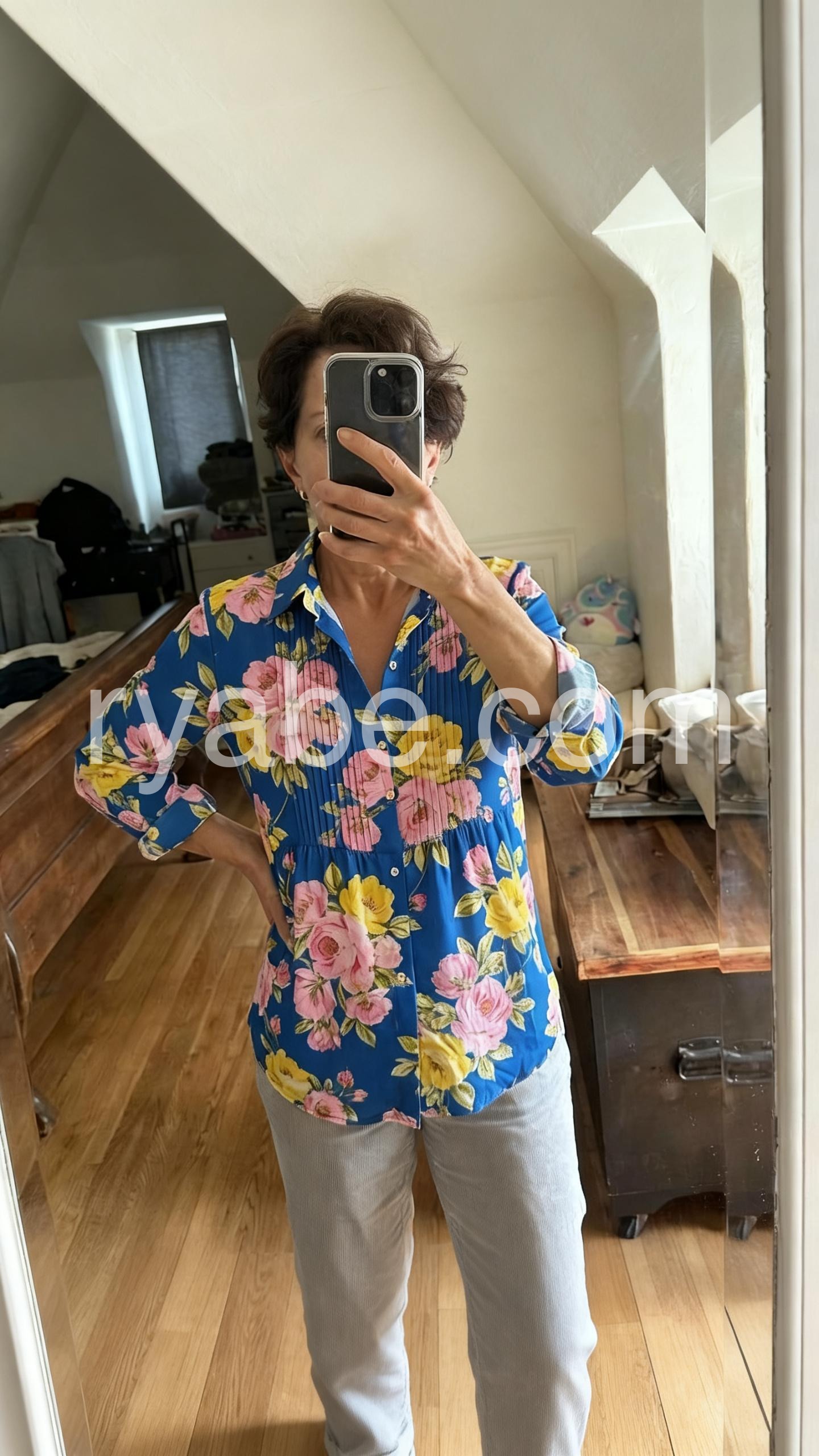 Trendy Blue Floral Pleated Shirt