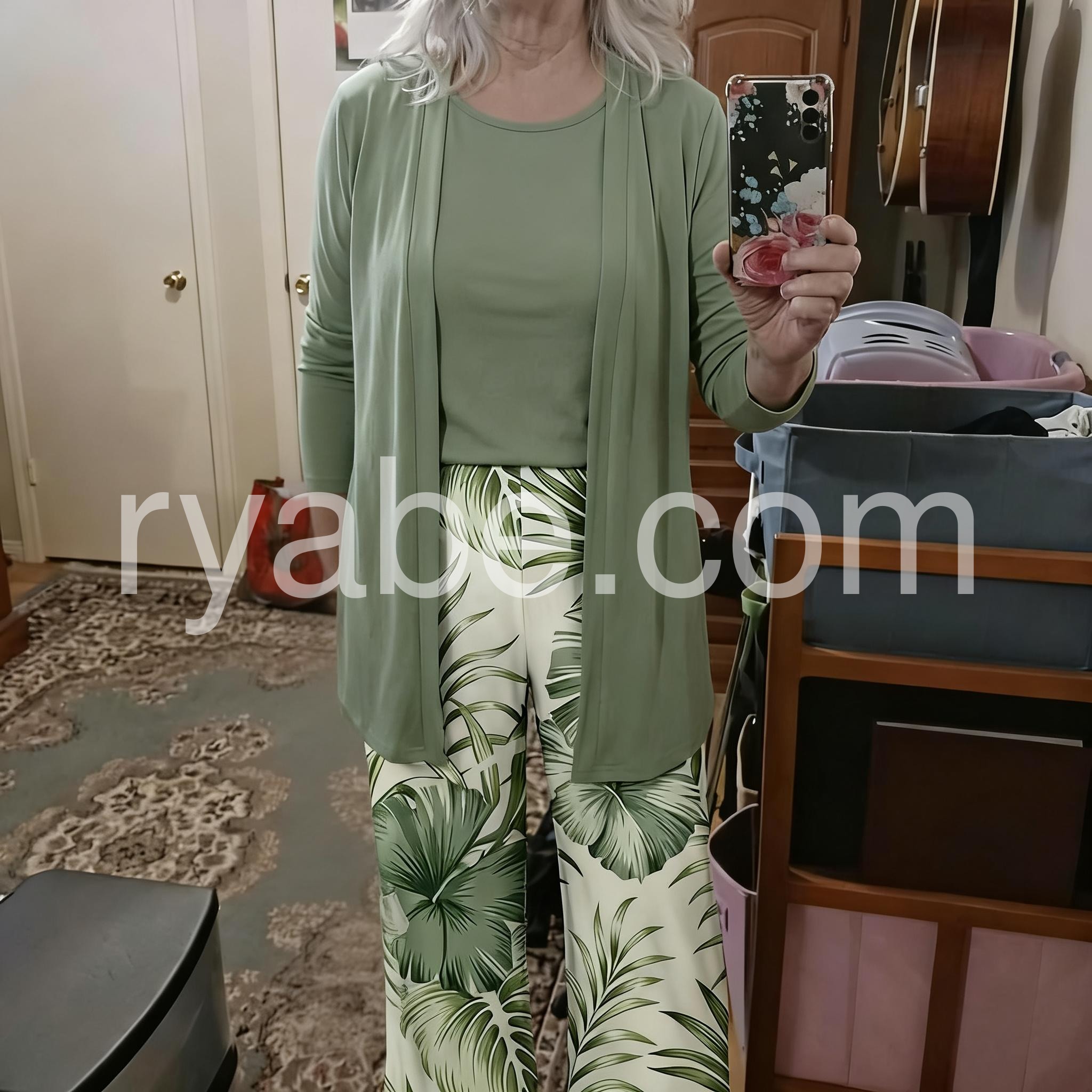 Yes!If you want a refund please contact our customer service at this email([email protected]).This three-piece set features a soft sage green drape cardigan with a relaxed fit. Paired with wide-leg pants in a leafy tropical print for a fresh, nature-inspired look. Lightweight fabric ensures comfort and breathability. Ideal for casual outings or warm-weather days. Effortlessly chic with a touch of boho elegance.