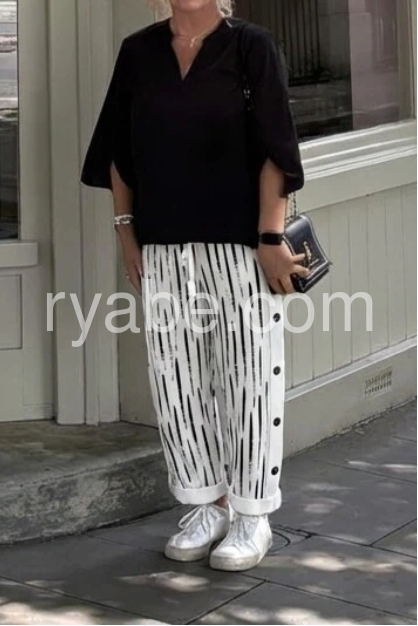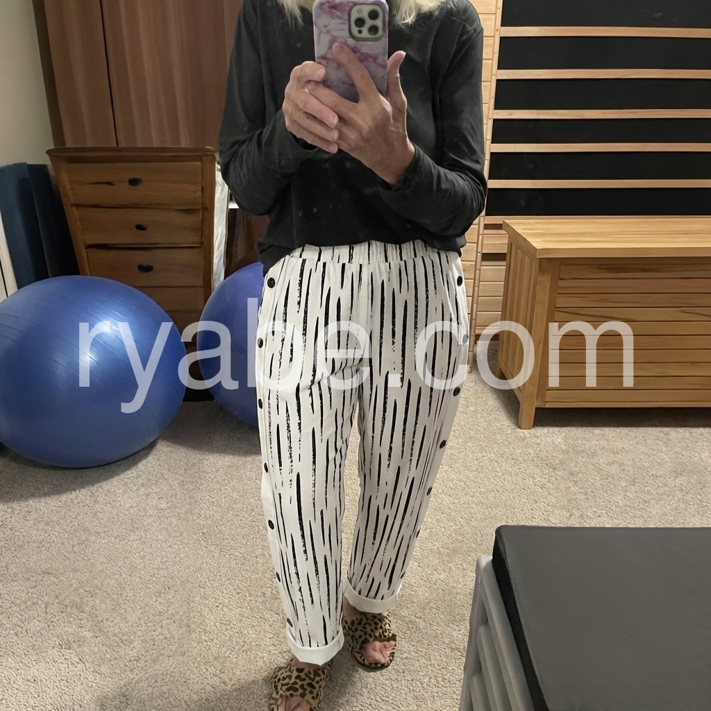 Yes!If you want a refund please contact our customer service at this email([email protected]).These relaxed-fit pants feature a bold black abstract stripe print on a white base. Elastic waistband and cuffed hems offer a cozy, stylish look. Side button details add a unique touch. Lightweight fabric perfect for casual wear. Effortlessly chic with a contemporary edge.