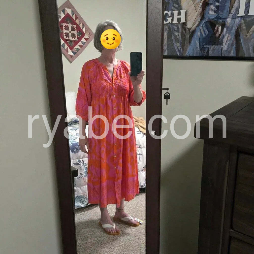 This super-glam hot pink and orange print midi dress is all you need to make a style impression, featuring a round v-neck collar, buttons down the front, and a shirred flattering top. Three-quarter length sleeves provide coverage and versatility to this everyday sophisticated blouse dress. Machine wash cold tumble dry low to medium heat. Iron if needed or lay flat to dry.