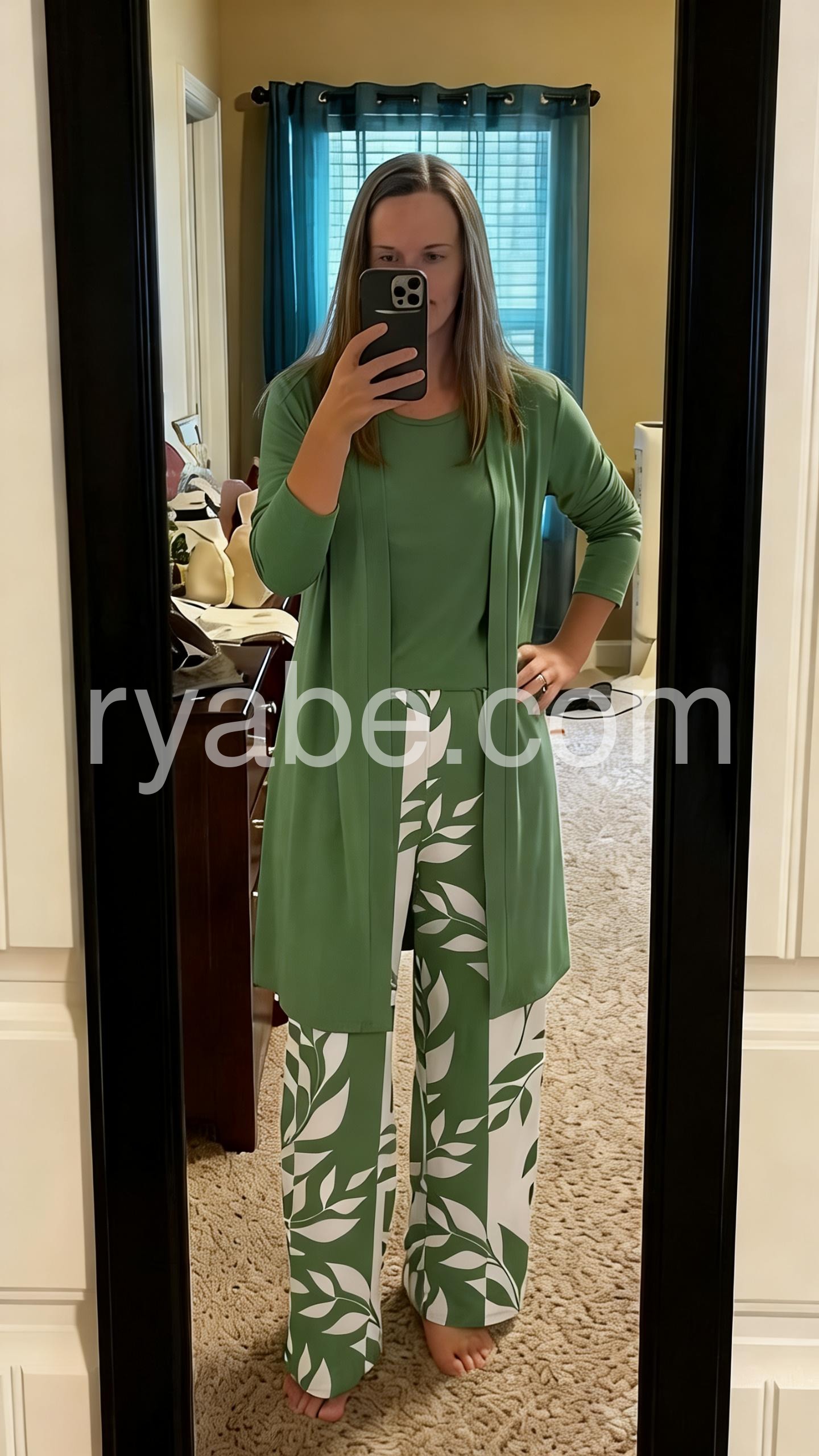 Yes!If you want a refund please contact our customer service at this email([email protected]).This three-piece set features leaf-patterned wide-leg pants in white and green, paired with a solid green top and open-front cardigan. The relaxed fit offers comfort and elegance. Perfect for casual outings or smart-casual events. Lightweight fabric ideal for warm weather. Effortlessly chic and easy to wear.