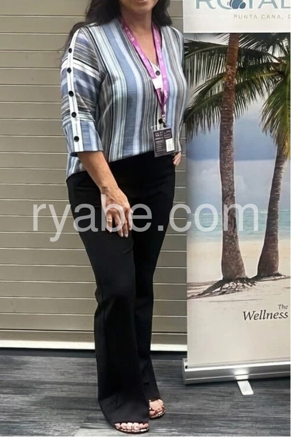 Yes!If you want a refund please contact our customer service at this email([email protected]).This V-neck top features vertical stripes in shades of blue, gray, and white. Front button closure and rolled sleeves with decorative side buttons. Lightweight fabric perfect for everyday wear. Relaxed fit with a modern touch. Ideal for pairing with jeans or shorts.