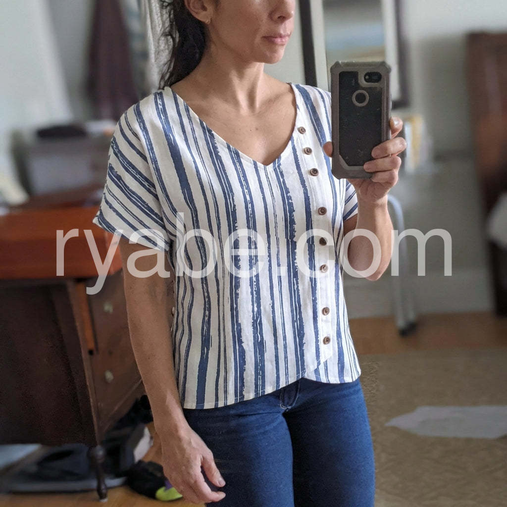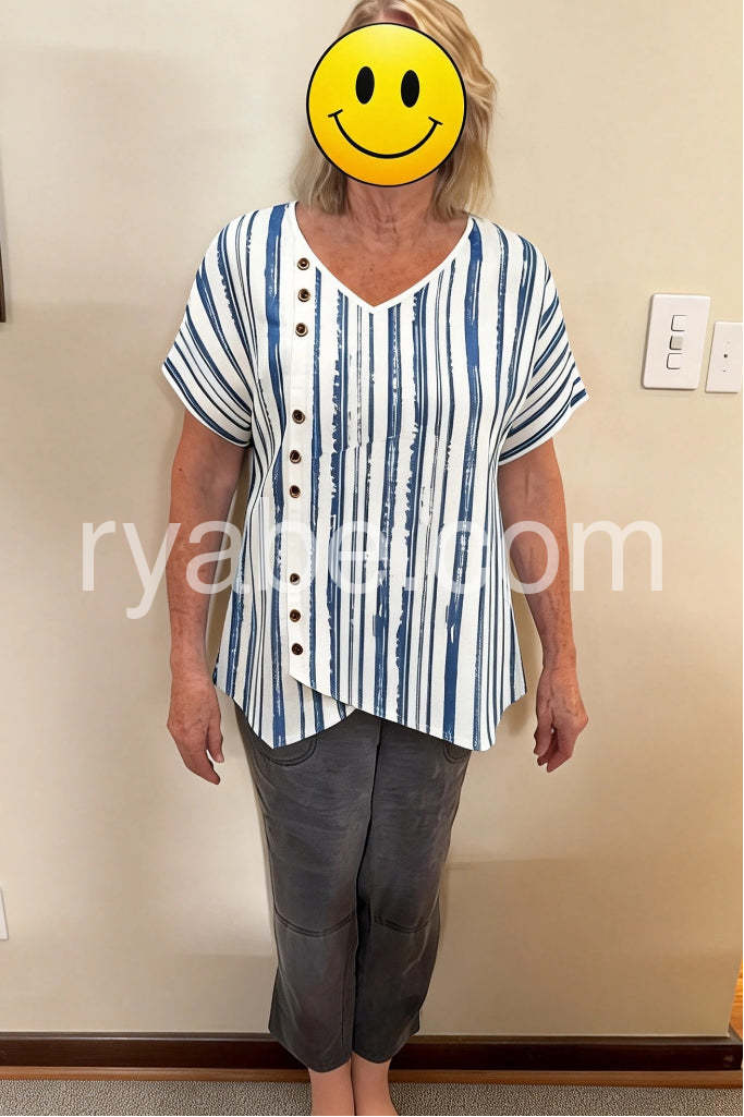 Yes!If you want a refund please contact our customer service at this email([email protected]).Bring a touch of seaside serenity to your wardrobe with this Nautical White Short Sleeve Striped V-Neck Top, a relaxed and stylish essential for warm-weather days. Crafted from lightweight, breathable fabric—likely cotton or linen blend—this top features a classic nautical-inspired vertical stripe pattern in soft blue and crisp white, with a subtle hand-painted texture that adds artisan charm. The V-neckline offers a flattering frame for the décolletage, while the front button placket in earthy brown tones provides both function and visual interest. Designed with short sleeves and an asymmetrical hem that gently flares at the sides, it creates a breezy, effortless silhouette perfect for layering or wearing solo. Pair it with khaki shorts, wide-leg pants, or denim for a look that’s both casual and chic. Ideal for beach outings, garden parties, or laid-back weekend errands, this top embodies the carefree spirit of coastal living. Inspired by the curated, boho-meets-nautical styles found on Lulus.com, it’s a versatile piece that brings comfort, style, and a hint of ocean breeze to every outfit.