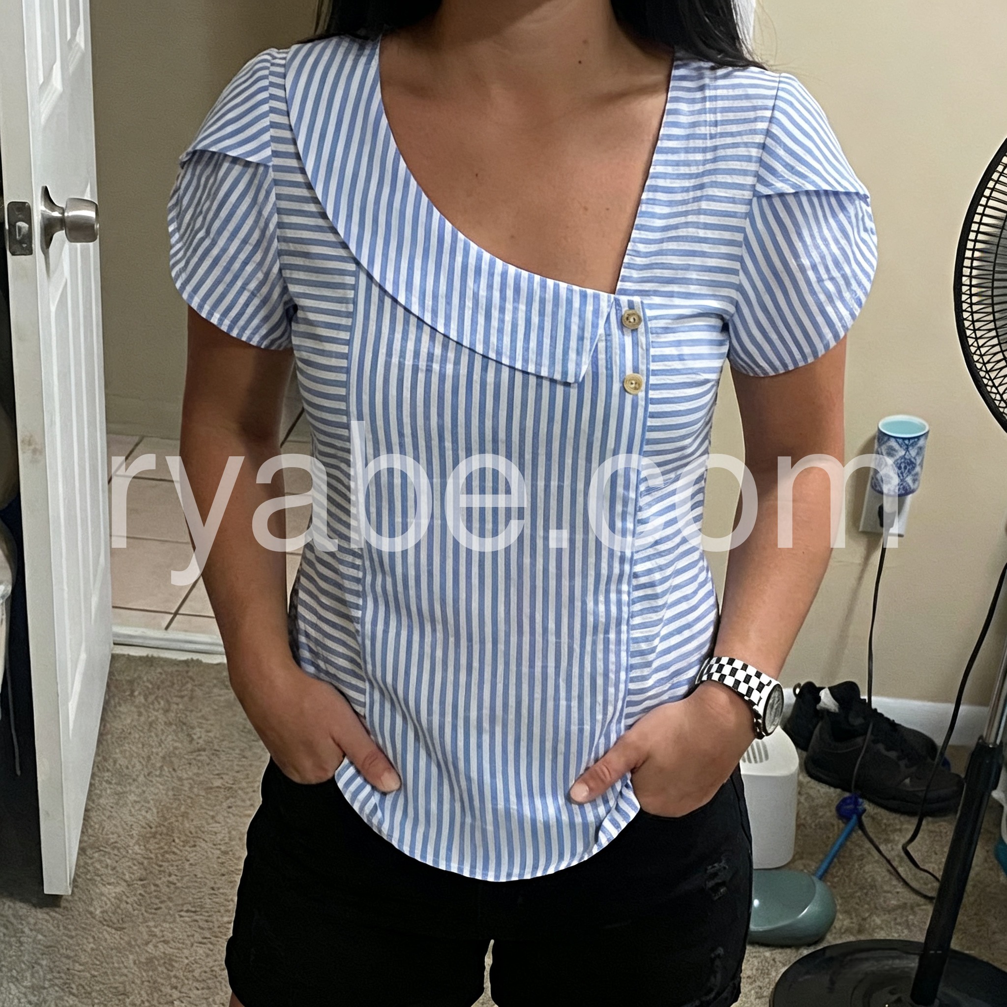 Yes!If you want a refund please contact our customer service at this email([email protected]).This blouse reimagines classic stripes with a bold, modern twist. The asymmetrical neckline, puff sleeves, and button detail create a unique, fashion-forward silhouette.