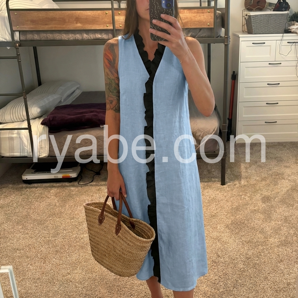 Sky Blue Black Ruffle Sleeveless Midi Dress