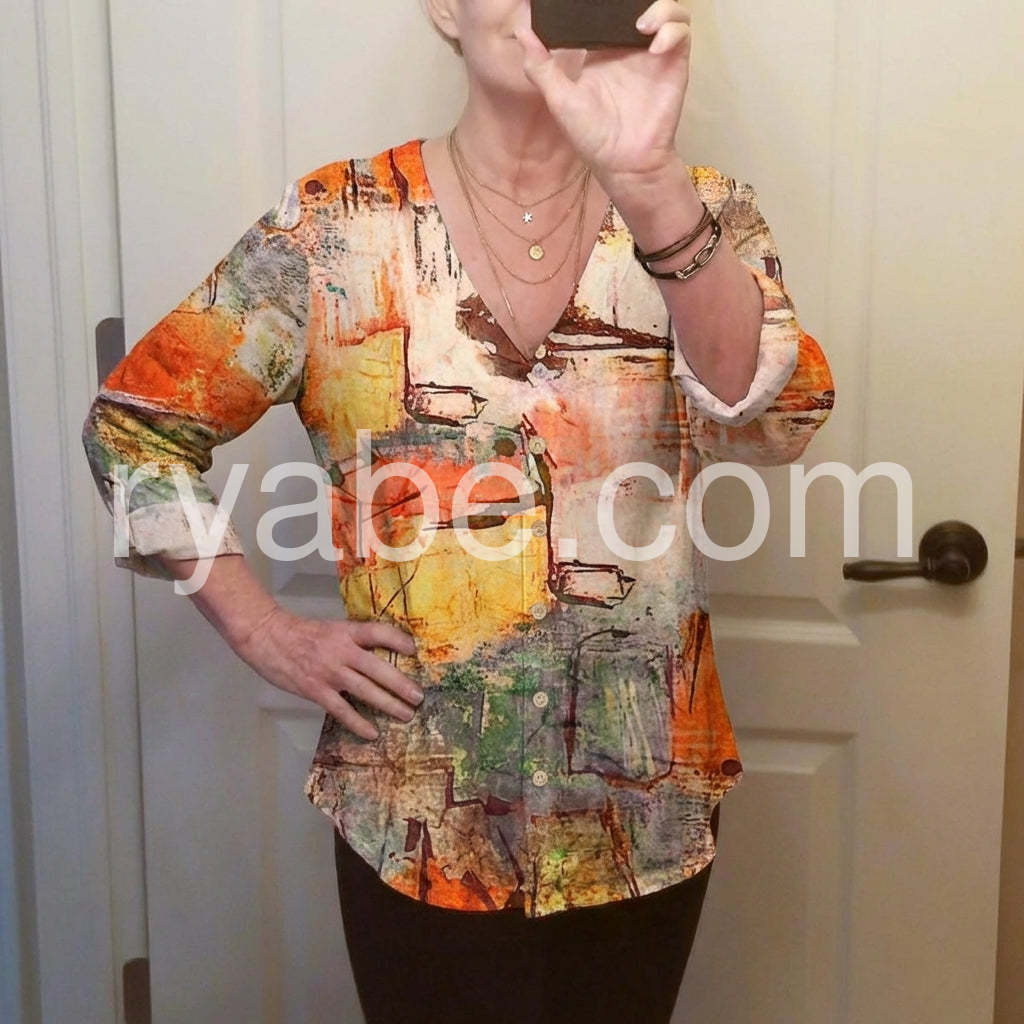 Yes!If you want a refund please contact our customer service at this email([email protected]).Make a bold fashion statement with this Chic Abstract Watercolor Print Top, a one-of-a-kind top that turns wearable art into everyday elegance. Crafted from soft, lightweight fabric—likely cotton or rayon blend—this blouse features a vibrant, painterly design inspired by watercolor strokes and abstract expressionism. The print blends warm tones of orange, rust, mustard, teal, and cream, creating a dynamic and artistic look that’s both eye-catching and sophisticated. Styled here with distressed denim and layered jewelry, it’s ideal for weekend outings, creative gatherings, or adding a burst of personality to your daily wardrobe. Whether you're heading to brunch or exploring the city, let this abstract-print top elevate your style with creativity, comfort, and boho flair.